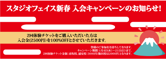 2回体験チケットをご購入いただいた方は、入会金(2500円)を100%OFFとさせていただきます。